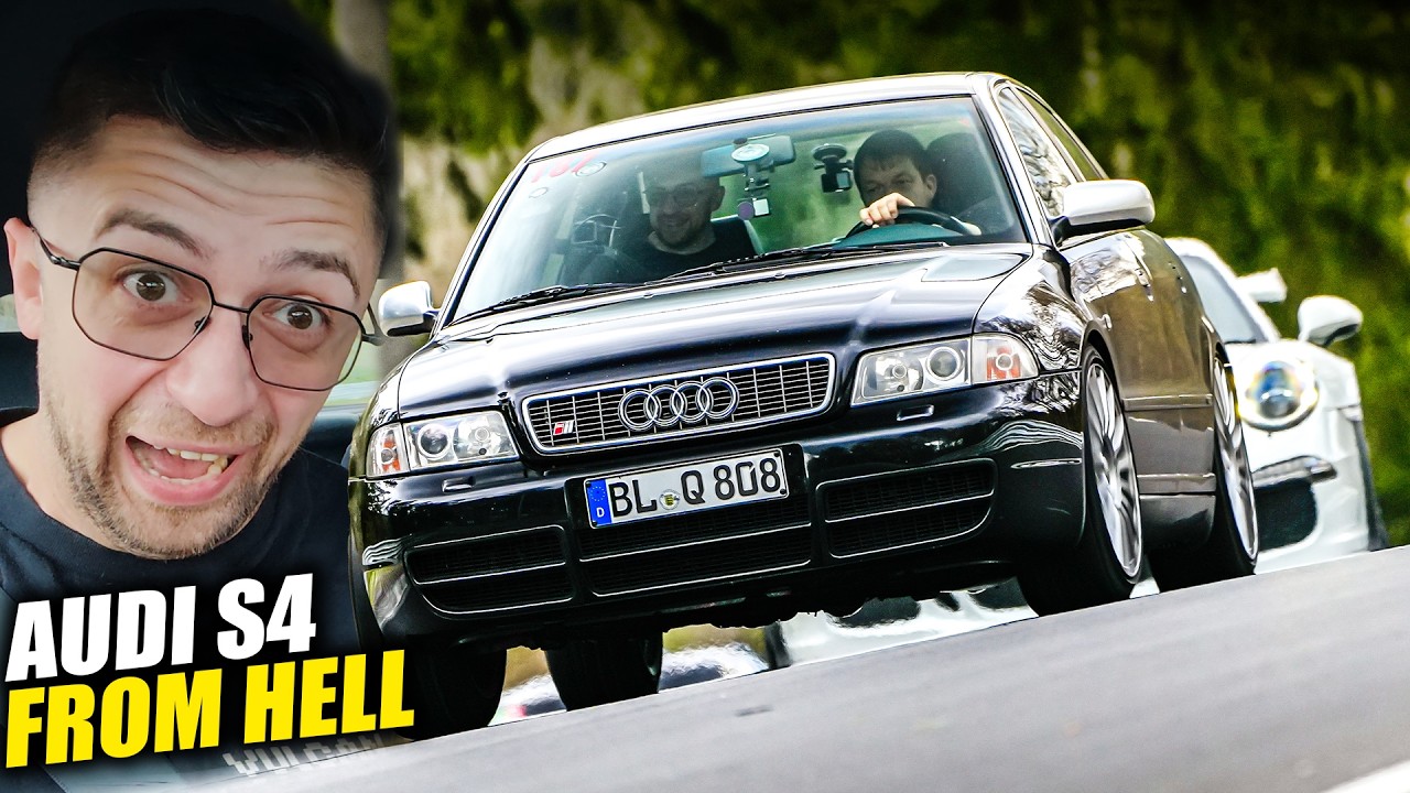 A highly modified Audi S4 B5 attacking the Nürburgring Nordschleife with aggressive cornering and classic quattro dynamics. The high-mileage performance sedan demonstrates impressive balance, power delivery, and driver skill while sliding through the famous circuit.
